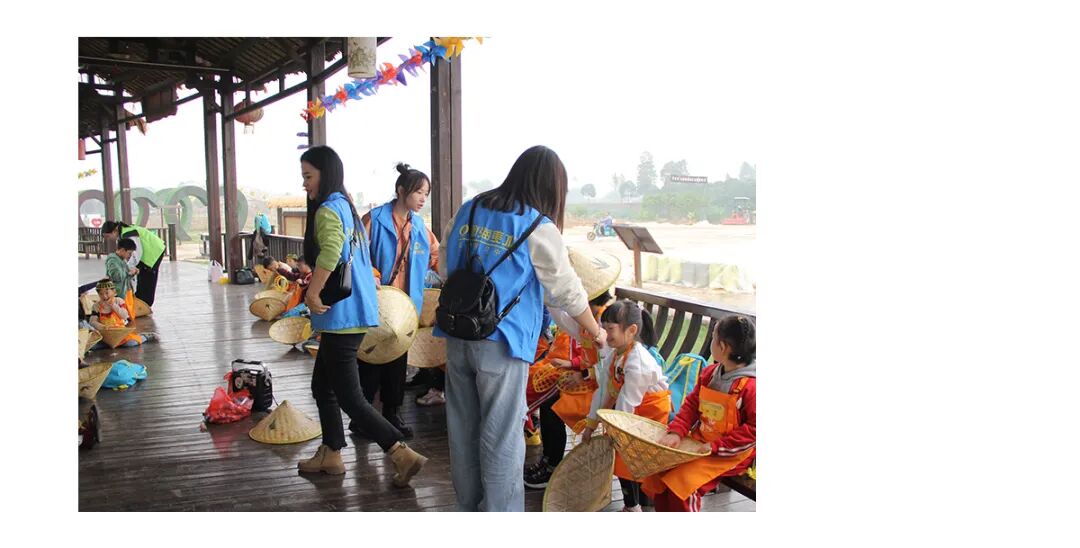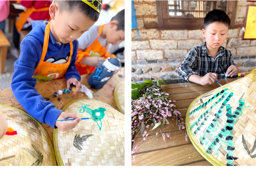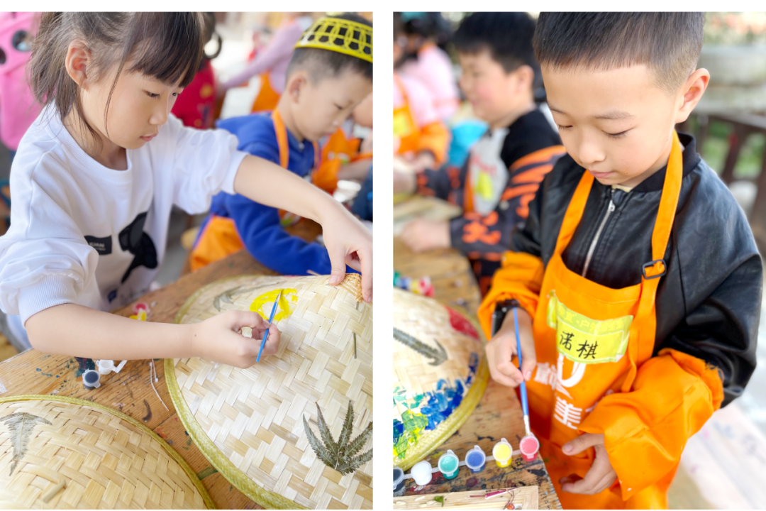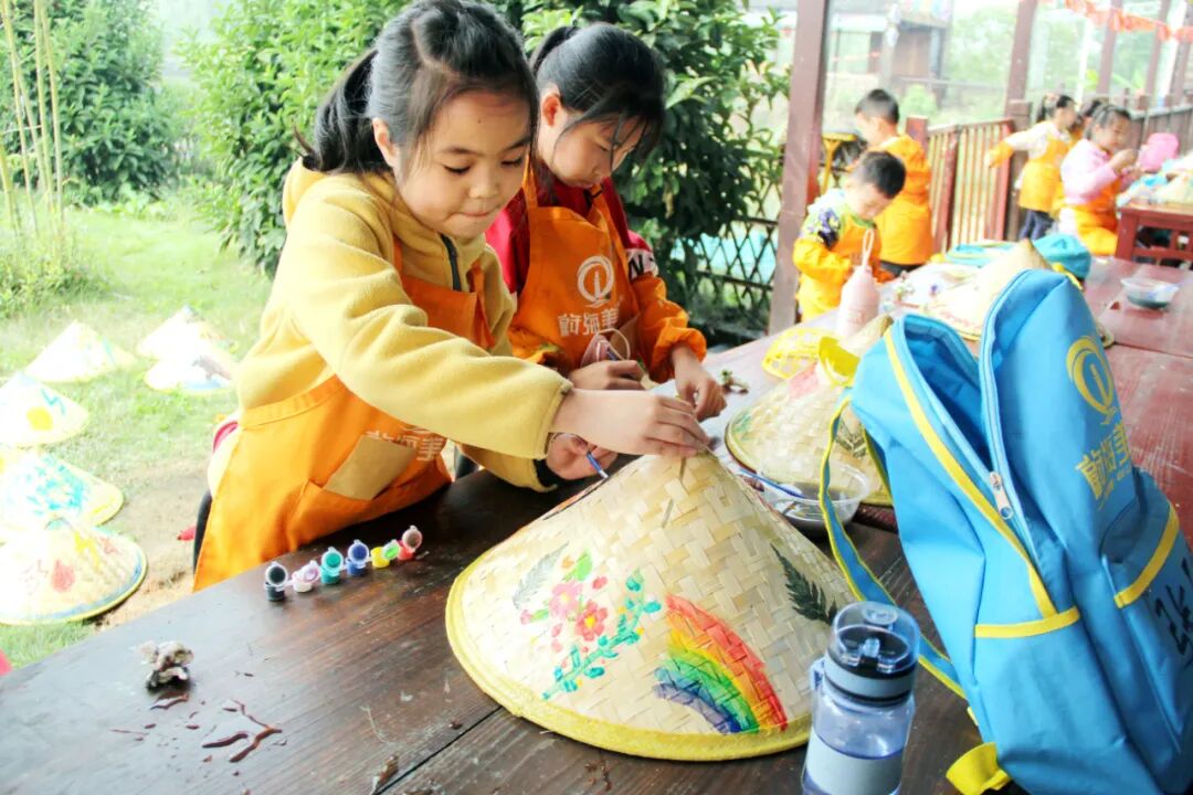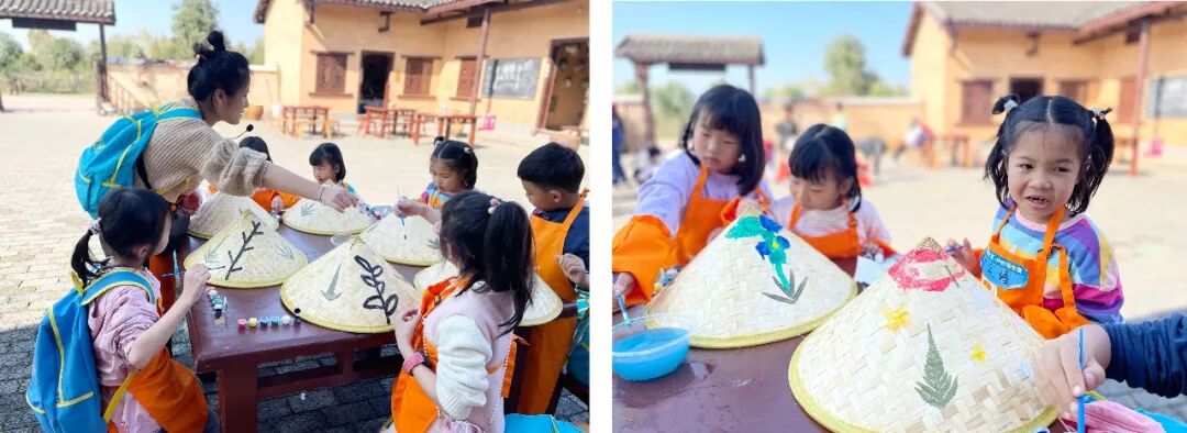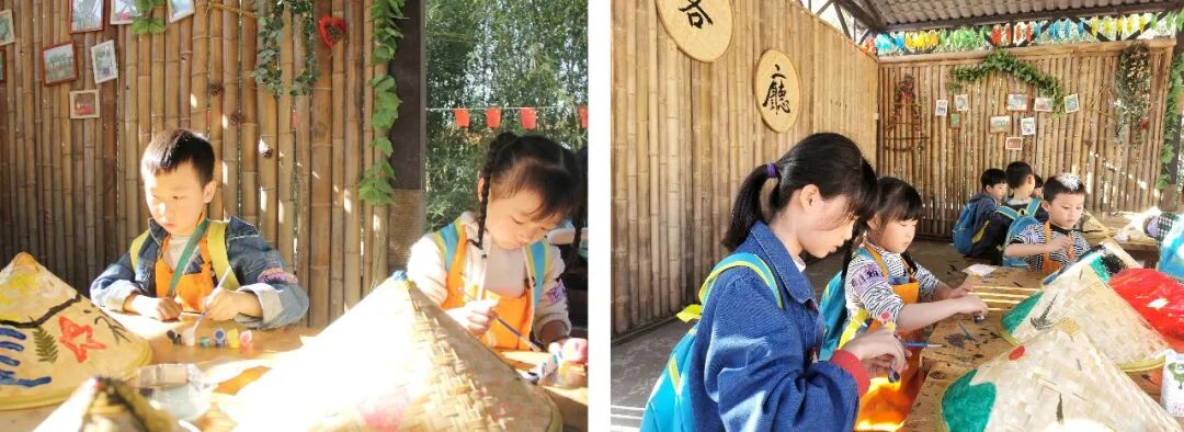 孩子们在老师的帮助下成功扎好了斗笠帽开始绘画创作哒~