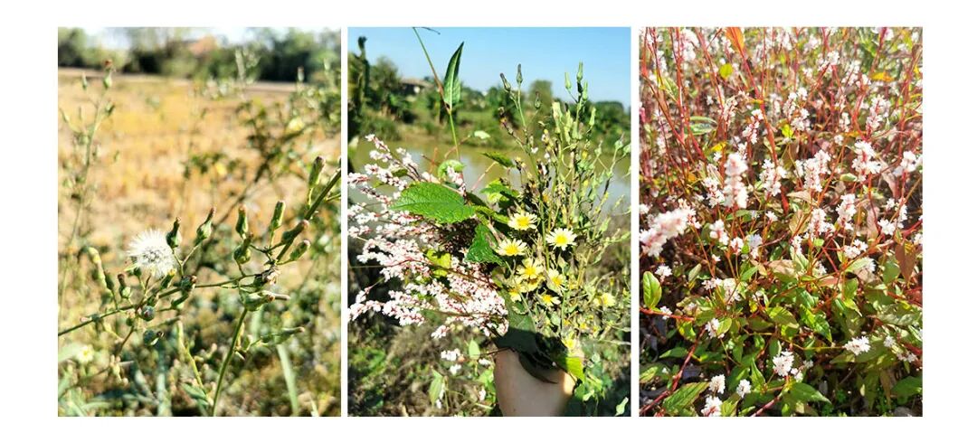稻田里面拾的稻穗,路边采摘的小花小叶子开始创绘稻香丰收画。
